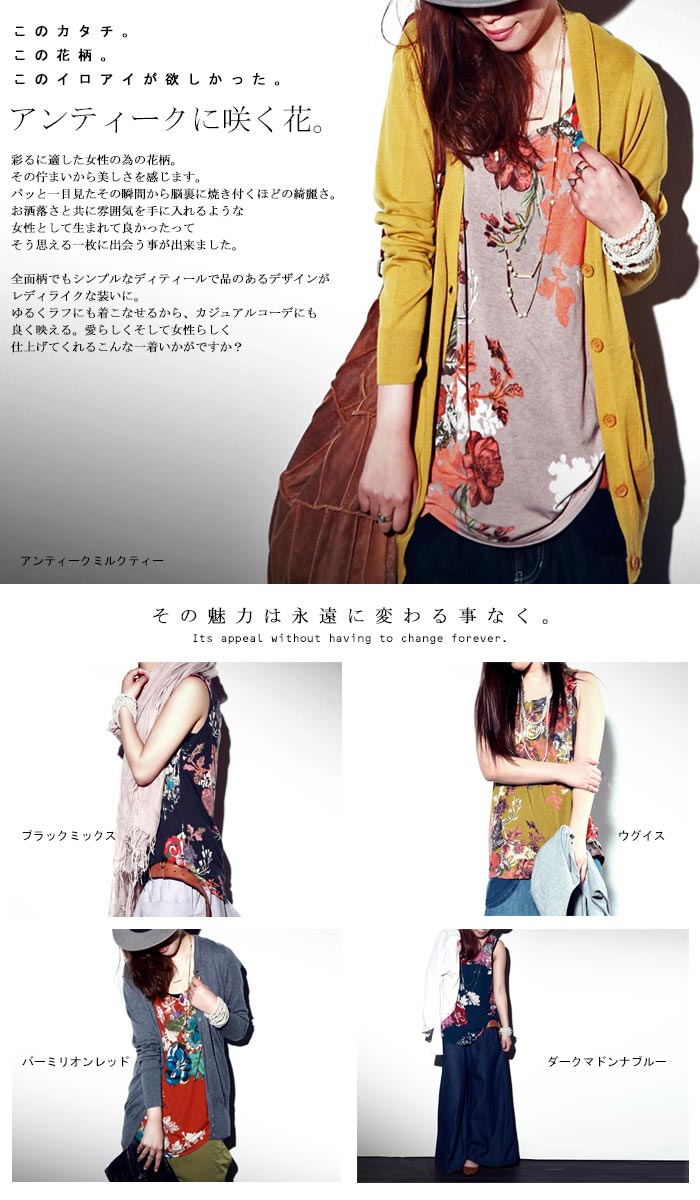 デザイナーヒトメボレのレトロアンティークなこの花柄、タンクトップになって益々コーデに取り入れやすい身近な存在になりました。